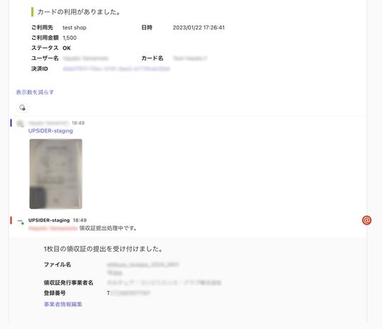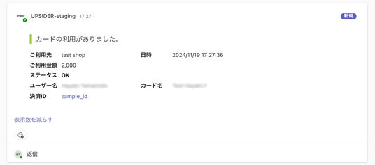 Microsoft Teamsにおいて、UPSIDER決済後に即時通知を受け取ることが可能です。通知内容には、利用先名、利用金額、利用日時、対象カード名、ユーザー名、決済IDが含まれ、企業の経理担当者・従業員は即座に決済内容を確認することができます。