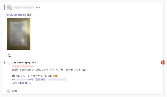 Microsoft Teamsに届いた決済通知のスレッドに証憑を添付するだけで、その決済に関連する証憑として自動的にUPSIDERに登録されます。