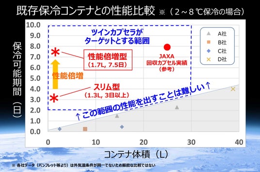 JAXAが国際宇宙ステーションから日本独自の物資回収技術を実証するために開発した再突入カプセル。2018年11月に宇宙実験で生成したタンパク質結晶を4℃に維持した状態で回収することに成功。大気圏再突入中も含めた回収までの5.6日間の断熱保冷容器内のサンプルの温度変化は0.3℃と、非常に高い断熱保冷性能が実証されており、ツインカプセラはこの技術を継承しています。
