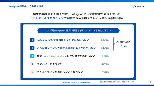 静止画や動画を中心に、ストーリーズやリールなど様々な見せ方で情報の拡散が期待できるInstagramですが、発信したい内容があってもInstagramの特長を活かした投稿がつくれない、効果的な運用方法がわからないといった悩みをよく耳にします。NAVICUSが先日開催した人事・採用担当者向けウェビナーの参加者アンケートでも、「採用目的のInstagramを運用する中で最も課題に感じること」について「学生に需要のあるコンテンツ」と「Instagramで伸びるコンテンツ」を挙げる声や、「機能の使い分け」に課題を抱えていることが明らかになりました。