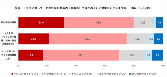災害・リスクへの対策としては、「防災用品の備蓄」が最も多く79.7%となりました。次いで「ソフト面(マニュアル整備、訓練・教育の実施など)」が75.0%、ハード面(オフィス環境整備など)が69.8%となっています。