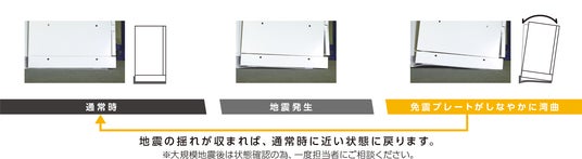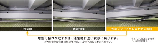 地震による免震プレートの湾曲変形が各接合部への負担を軽減することにより、接合部の破断、ビスの引抜を防ぎ、転倒・移動を抑制する当社独自技術です。