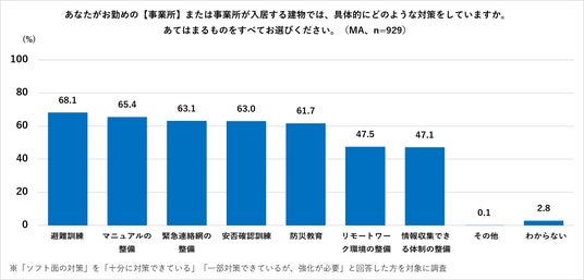 ソフト面で具体的に実施している対策では、「避難訓練」が最多で68.1%となりました。一方で、「リモートワーク環境の整備」(47.5%)、「情報収集できる体制の整備」(47.1%)がともに半数以下と、課題が浮き彫りになりました。