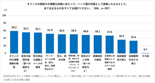 ハード面で具体的に実施している対策は、「オフィス内の避難動線の確保」が59.2%で最多となりました。次いで「家具の転倒対策」(55.7%)、「防災用品の備蓄スペースの確保」(55.1%)、「サーバールームの保全」(51.9%)と続きます。ハード面は備蓄やソフト面に比べ全体的にスコアが低い傾向となりました。