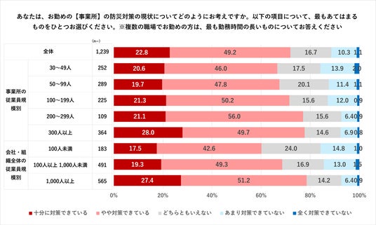 現在勤めている事業所における防災対策の現状について尋ねたところ、「十分に対策できている」は22.8%となり、4人に1人以下となりました。特に、事業所や会社・組織全体の従業員規模が小さいほど「十分に対策できている」「やや対策できている」と回答した割合が少なく、対策に課題を感じている人が多い結果となりました。