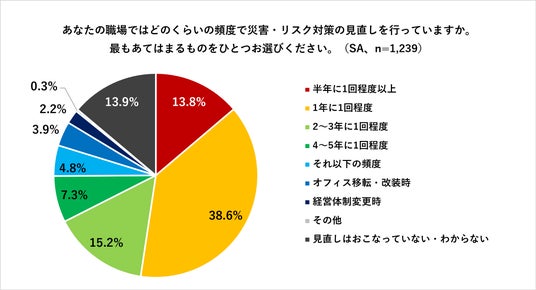 災害・リスク対策を見直す頻度については、「半年に1回程度以上」(13.8%)と「1年に1回程度」(38.6%)の合計が52.4%と半数以上となりました。一方で、「2~3年に1回程度」(15.2%)と「4~5年に1回程度」(7.3%)を合わせると74.9%となり、残りの4分の1はそれ以下の頻度か不定期で見直している結果となりました。