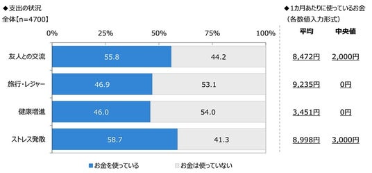 - 1カ月の平均支出額「友人との交流」8,472円、「旅行・レジャー」9,235円、「健康増進」3,451円、「ストレス発散」8,998円
