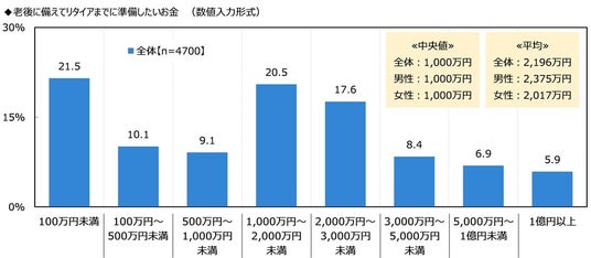 また、老後に備えてリタイアまでに準備したいお金を聞いたところ、「100万円未満」(21.5%)や「1,000万円~2,000万円未満」(20.5%)、「2,000万円~3,000万円未満」(17.6%)に回答が分かれ、平均は2,196万円でした。