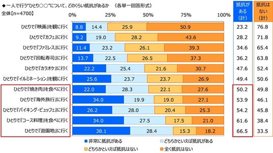 - 一人で行う“ひとり○○”への抵抗感 半数以上が「抵抗がある」と感じるのは“ひとり焼き肉”“ひとり海外旅行”“ひとりバイキング・ビュッフェ”“ひとりコース料理”“ひとり遊園地”