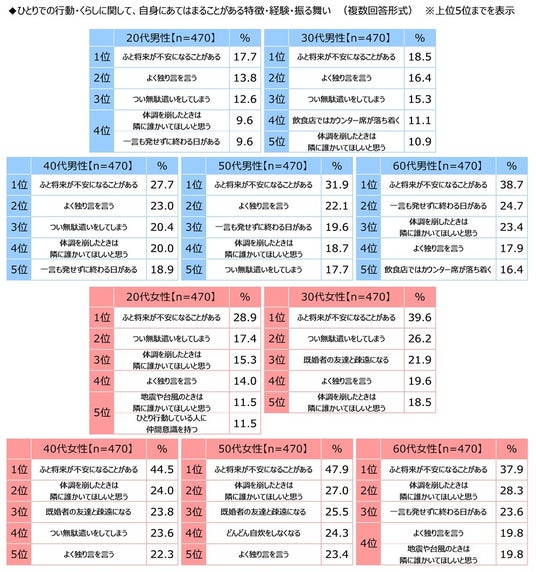 男女・年代別にみると、30代男性の4位と60代男性の5位には「飲食店ではカウンター席が落ち着く」、20代女性の5位と60代女性の4位には「地震や台風のときは隣に誰かいてほしいと思う」、30代から50代女性の3位には「既婚者の友達と疎遠になる」、20代女性の5位には「ひとり行動している人に仲間意識を持つ」、50代女性の4位には「どんどん自炊をしなくなる」が挙がりました。