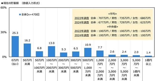 現在の貯蓄額を聞くと、平均は677万円。また、貯蓄額がない人の割合は25.3%でした。
