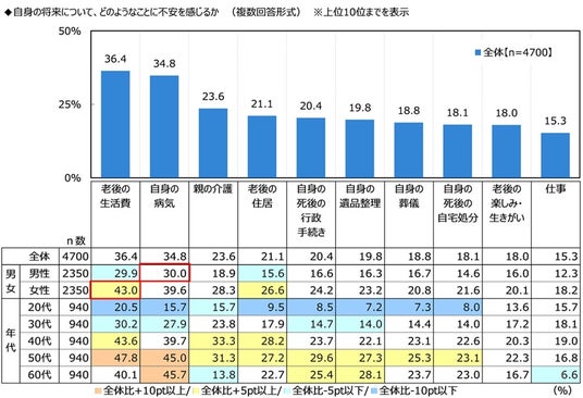 - 将来について不安を感じること TOP2は「老後の生活費」「自身の病気」男性では「自身の病気」、女性では「老後の生活費」が1位