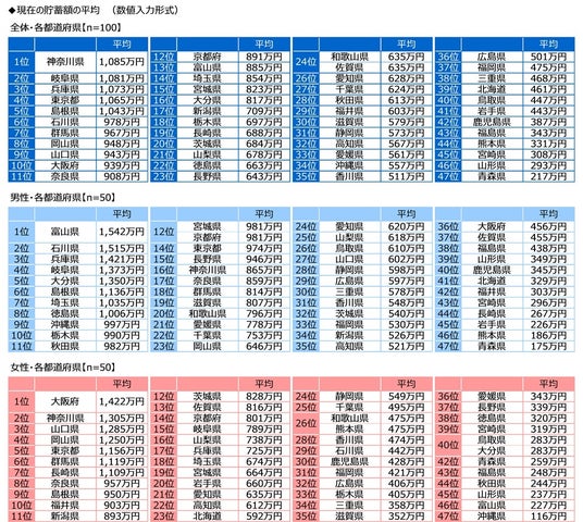 都道府県別にみると、現在の貯蓄額の平均は、1位は神奈川県(1,085万円)、2位は岐阜県(1,081万円)、3位は兵庫県(1,073万円)、4位は東京都(1,065万円)、5位は島根県(1,043万円)となり、男女別では男性1位が富山県(1,542万円)、女性1位が大阪府(1,422万円)でした。