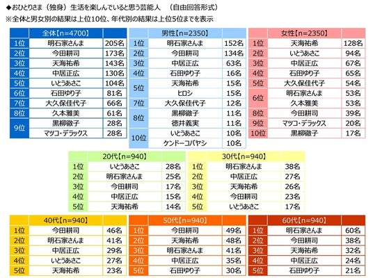 - おひとりさま(独身)生活を楽しんでいると思う芸能人1位「明石家さんまさん」2位「今田耕司さん」3位「天海祐希さん」20代では「いとうあさこさん」が1位