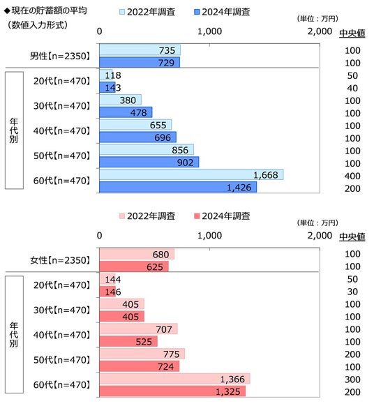 また、中央値は、60代男性では2022年400万円→2024年200万円、50代女性では2022年200万円→2024年100万円、60代女性では2022年300万円→2024年200万円と、大きく変化しました。