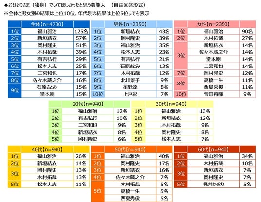 また、男性回答では1位「新垣結衣さん」、2位「岡村隆史さん」、3位は「福山雅治さん」、女性回答では1位「福山雅治さん」、2位「木村拓哉さん」、3位「新垣結衣さん」「佐々木蔵之介さん」「堂本剛さん」「二宮和也さん」という結果に。