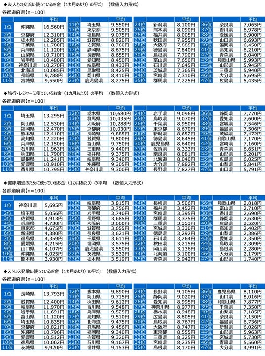都道府県別に平均をみると、“友人との交流に使っているお金”では1位は沖縄県(16,560円)、2位は京都府(12,310円)、3位は栃木県(12,285円)、“旅行・レジャーに使っているお金”では1位は埼玉県(13,295円)、2位は岡山県(12,530円)、3位は福岡県(12,470円)、“健康増進のために使っているお金”では1位は神奈川県(5,695円)、2位は埼玉県(5,056円)、3位は佐賀県(4,913円)、“ストレス発散に使っているお金”では1位は長崎県(13,793円)、2位は滋賀県(12,400円)、3位は岐阜県(11,970円)でした。