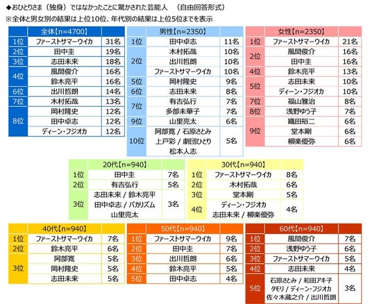 おひとりさま(独身)ではなかったことに驚かされた芸能人を聞いたところ、1位「ファーストサマーウイカさん」(31名)、2位「田中圭さん」(19名)、3位「志田未来さん」(18名)、4位「風間俊介さん」「鈴木亮平さん」(いずれも16名)となりました。