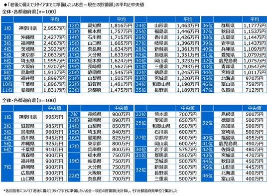 ここで、“老後に備えてリタイアまでに準備したいお金”と“現在の貯蓄額”の差をみると、平均と中央値のいずれも神奈川県(平均2,955万円、中央値995万円)が最も大きくなり、平均では沖縄県(2,427万円)、福岡県(2,406万円)、中央値では滋賀県(985万円)、鳥取県(960万円)が続きました。
