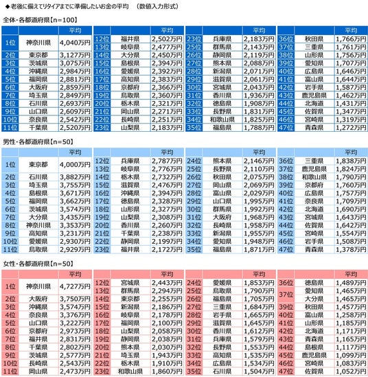 - 老後に備えてリタイアまでに準備したいお金全体の平均は2,196万円、男性では2,375万円、女性では2,017万円都道府県別では1位「神奈川県」4,040万円、2位「東京都」3,127万円、3位「茨城県」3,075万円