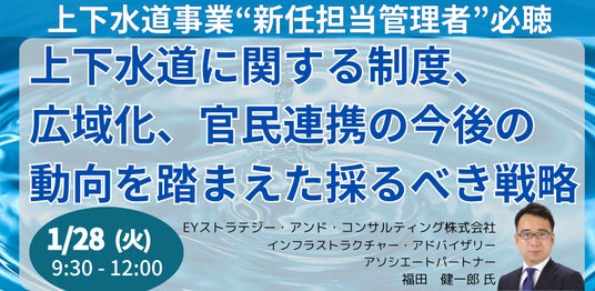 JPI(日本計画研究所)は、EYストラテジー・アンド・コンサルティング株式会社 インフラストラクチャー・アドバイザリー アソシエートパートナー 福田 健一郎 氏を招聘し、上下水道に関する制度、広域化、官民連携の今後の動向を踏まえた採るべき戦略について詳説いただくセミナーを開催します。