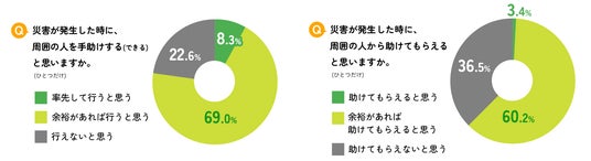 災害が発生した時に、周囲の人を手助けする(できる)と思いますかと聞いたところ「率先して行うと思う」が全体の8.3%、「余裕があれば行うと思う」が69.0%、「行えないと思う」が22.6%という結果になりました。一方、災害が発生した時に、周囲の人から助けてもらえると思いますかと聞いたところ「助けてもらえると思う」が全体の3.4%、「余裕があれば助けてもらえると思う」が60.2%、「助けてもらえないと思う」が36.5%でした。災害時の「たすけあい」を実現するためには各自が“余裕”を持つことが重要と言えそうです。
