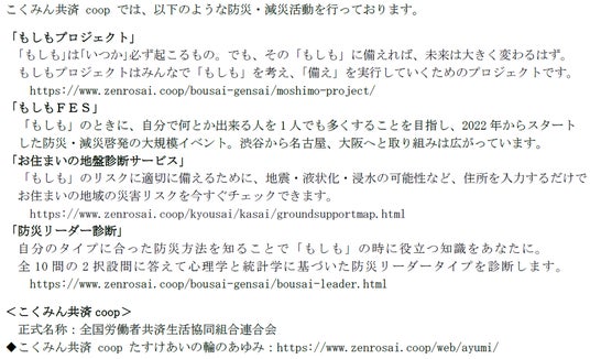 避けることのできない台風や地震などの災害が増える昨今、住まいの保障から事業を開始したこくみん共済 coop では、万一から命と暮らしを守る 防災・減災活動に取り組んでいます。