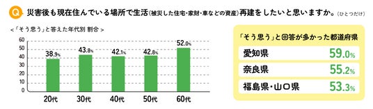 災害後も現在住んでいる場所で生活(被災した住宅・家財・車などの資産)再建をしたいと思うか聞いたところ、全体で43.9%が「そう思う」と回答し、「そう思わない」は19.4%でした。年代別では、20代は38.9%、60代は52.0%が「そう思う」と回答しました。また、都道府県別で「そう思う」と回答が多かったのは、愛知で59.0%、奈良で55.2%、福島・山口で53.3%でした。