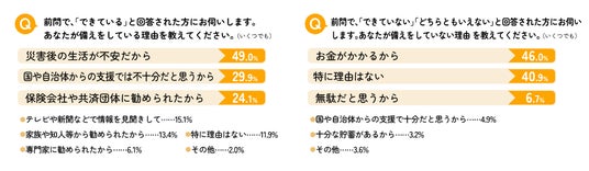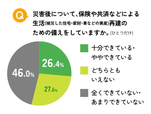災害後について、保険や共済などによる生活(被災した住宅・家財・車などの資産)再建のための備えをしていますかとの質問に対しては全体の46.0%が「できていない」と回答。特に20代は55.4%が「できていない」と回答しました。「できている」と回答した理由(複数回答)で最も多かったのは「災害後の生活が不安だから」49.0%、次いで「国や自治体からの支援では不十分だと思うから」29.9%。一方「できていない/どちらともいえない」と回答した理由(複数回答)で最も多かったのは「お金がかかるから」46.0%と、経済的な負担を理由にする人が半数近くとなりました。また、「特に理由はない」は40.9%という結果になりました。