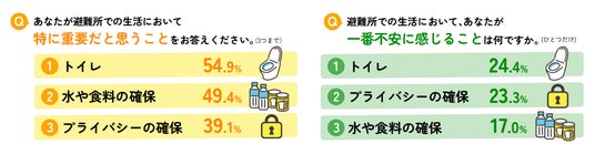 あなたが避難所での生活において特に重要だと思うこと(3つまで)を聞いたところ、「トイレ」が54.9%、「水や食料の確保」が49.4%、「プライバシーの確保」が39.1%となり、「暑さ寒さ対策」が34.1%、「睡眠」が27.3%と続きました。その上で、避難所での生活において、あなたが一番不安に感じること(ひとつだけ)を聞いたところ、こちらも「トイレ」が24.4%、「プライバシーの確保」が23.3%、「水や食料の確保」が17.0%となり、次いで「防犯」が8.9%となりました。