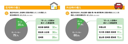 直近1年以内に、「在宅時」と「外出時」に災害が発生したことを想定した防災対策を行いましたかと聞いたところ、在宅時の防災対策を「行った」が20.3%で「行っていない」が79.7%となり、外出時の防災対策を「行った」が11.4% で「行っていない」が88.6%といずれも半数以上が「行っていない」と回答がありました。なお「行った」と回答が多かった上位の都道府県は以下の通りです。