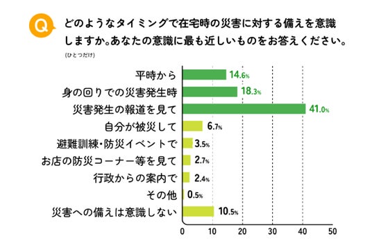 どのようなタイミングで在宅時の災害に対する備えを意識しますかと聞いたところ、一番多かったのが「災害発生の報道を見て」が41%で、「身の回りでの災害発生時」が18.3%、「平時から」14.6%の結果となりました。都道府県別で「平時から」意識していると回答が多かったのは、静岡・和歌山が22.9%、次いで東京が21.9%、新潟・大分が20%という結果となりました。