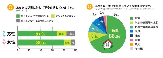 あなたは災害に対して不安を感じていますかと聞いたところ、全体で74.4%が「感じている」と回答がありました。性別で見ると男性が67.9%、女性が80.1%と女性の方が不安を感じているとの回答が多い傾向がみられました。