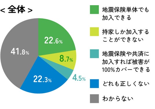 また、地震保険について、正しいものはどれだと思いますかという問いでは、「地震保険単体でも加入できる」「持家しか加入することができない」「地震保険や共済に加入すれば被害が100%カバーできる」「どれも正しくない」「わからない」の5つの選択肢から1つを選ぶ方式で、以下のような結果となりました。