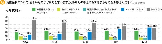 よって正しい回答は「どれも正しくない」となり、全体では22.3%でした。一方、「わからない」は41.8%で、地震保険についての理解度が低い傾向がみられました。年代別に見ると、「どれも正しくない」を選んだ割合は、20代が13.5%と一番低く60代が32.6%と一番高い結果となりました。