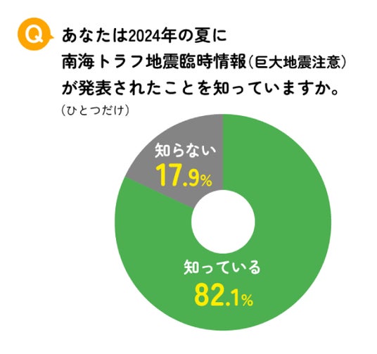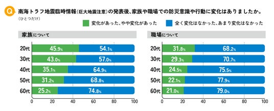 あなたは2024年の夏に南海トラフ地震臨時情報(巨大地震注意)が発表されたことを知っているか聞いたところ、全体では「知っている」が82.1%、「知らない」が17.9%となりました。「知っている」と回答した方に、南海トラフ地震臨時情報(巨大地震注意)の発表後、家族や職場での防災意識や行動に変化はありましたかと聞いたところ、家族については全体の35.6%、職場については若干下がり、全体の25.7%が「変化があった」と回答がありました。いずれも、世代が若くなるにつれて「変化があった」の割合が増加する傾向がみられます。