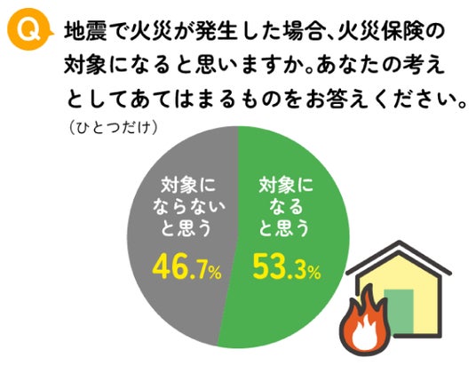 地震で火災が発生した場合、火災保険の対象になると思いますかと聞いたところ、全体では「対象になると思う」が53.3%、「対象にならないと思う」が46.7%でした。地震が原因による火災は、火災保険の対象ではなく、地震保険が(での)対象となるため、半数以上が正しい知識を知らないという結果となりました。