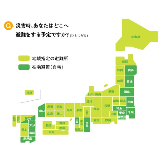 災害時、あなたはどこへ避難をする予定ですか?と聞いたところ、「地域指定の避難所」の44.8%、「在宅避難(自宅)」の39.7%が大半を占めていました。「在宅避難(自宅)」では、20代が29.4%、30代が38.1%、40代が42.1%、50代が43.4%、60代が45.3%と、年代が上がるにつれの割合が増える結果となりました。また、熊本は18.1%、新潟や茨城は17.1%と、「車中」の割合が17%を超えています。また、「親戚や知人宅」との回答は全体では4.4%で、多かったのは熊本で11.4%、広島で9.5%でした。東京では1.9%と低い結果となりました。
