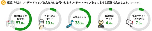 「見た」と回答した方にハザードマップをどのような媒体で見ましたかと聞いたところ(複数回答)、全体の57.8%が「自治体からの配布物」と回答。次いで多かったのが「自治体サイト」38.2%と、多くの方が自治体からの情報でハザードマップを把握していたことが分かりました。