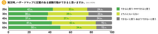 また、発災時、ハザードマップに記載のある避難行動ができると思いますかと聞いたところ全体の42.5%が「できると思う」と回答。「直近1年以内に、外出時に災害が発生したことを想定した防災対策をした」方に限れば、64.7%が「できると思う」と回答しており、事前に防災対策を行うことが自信につながる傾向がうかがえます。