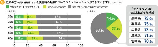 近所の方々(同じ避難所エリア)と災害時の対応についてコミュニケーションができていますかと聞いたところ「できている」と回答したのは全体の14.1%で、年代別でみると60代が18.3%と一番高い結果となりました。また、都道府県別でみると「できていない」と回答した方が70%以上だった地域は多い順に、長崎79%、群馬75.2%、広島73.3%、鳥取71.4%となり全体的にコミュニケーション不足の傾向がみられました。