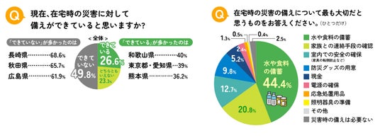 現在、在宅時の災害に対して備えができていると思いますかと聞いたところ「できている」と回答したのは全体の26.6%。都道府県別にみると高い順に和歌山が40%、東京・愛知が39%、次いで熊本が36.2%でした。一方、「できていない」と回答が多かったのは、長崎が68.6%、秋田が65.7%、次いで広島が61.9%という結果になりました。