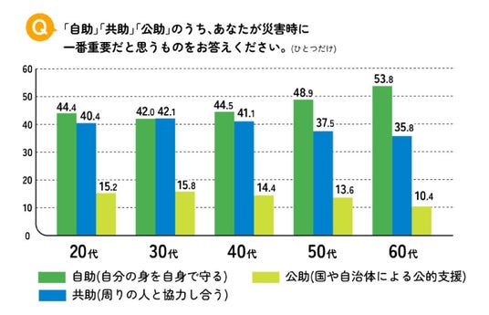 「自助」「共助」「公助」のうち、あなたが災害時に一番重要だと思うものを聞いたところ「自助(自分の身を自身で守る)」が46.7%、「共助(周りの人と協力し合う)」が39.4%、「公助(国や自治体による公的支援)」が13.9%の結果となりました。年代別にみると60代が「自助(自分の身を自身で守る)」53.8%と回答が多い傾向にありました。