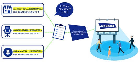 LIVE BOARDネットワークの対象となる全国約110の屋外ビジョンの来訪者の訪問履歴を、「docomo Sense(TM)(旧名、顧客理解エンジン)」や「docomo data square(R)」等を用いて分析。希望となるターゲット訪問者割合が高いビジョンをランキング化にして提供することが可能です。