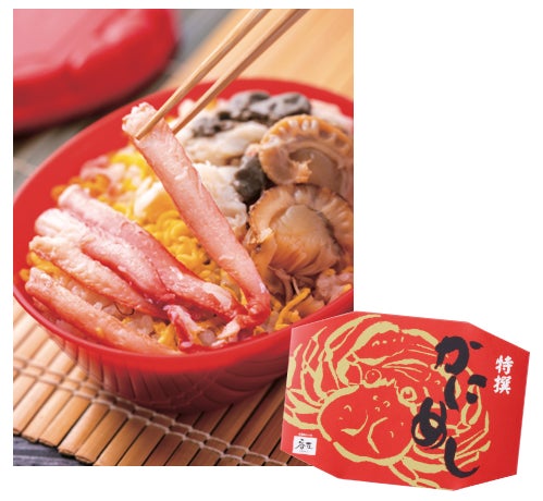 「駅弁」にかにめしは数あれど、番匠本店がダントツにおいしい! かにの出汁が効いた炊き込みごはんの上に乗った、ふっくらと大きなかに足とほぐし身は旨みが濃厚。かに味噌が乗っているのも最高です。