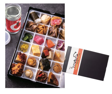 一口サイズの青森の郷土料理を詰め込んだ24マス弁当。素朴な甘みのかぼちゃ餅やコク旨のホタテやイカメンチ、酸味のきいた赤カブ漬けなどすべてが異なる調理法で飽きません。お酒を飲みながらつまむのに最適!