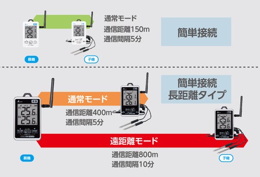 従来は見通し距離150mが最高でしたが、今回のモデルは通常のもの以外に長距離タイプをご用意。長距離タイプは通常状態で見通し距離400mまで届き、遠距離モードに設定すると800mまで通信します。