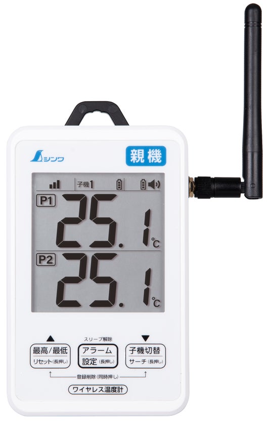 1台の親機に最大5台の子機が登録でき、親機は3台まで同一子機を管理できるので、自宅や作業場に親機を設置することで、いつでも子機の置かれた場所の温度の状態を確認できます。