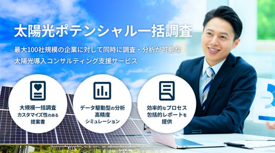 コンサルティング事業者様向けに、地域または業界の企業群に対する太陽光発電導入の包括的な診断・分析レポートを提供する新サービスです。自治体の脱炭素化目標達成を支援し、地域全体の再生可能エネルギー導入を促進します。