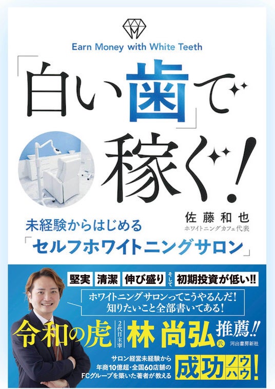 『「白い歯」で稼ぐ! 未経験からはじめる「セルフホワイトニングサロン」』著者・佐藤和也氏は自分のために購入した一台のホワイトニングマシンで、2015年に4坪のサロンを開業しました。その後9年間で北海道から沖縄まで、全国に60店舗展開の事業グループへ急成長。
